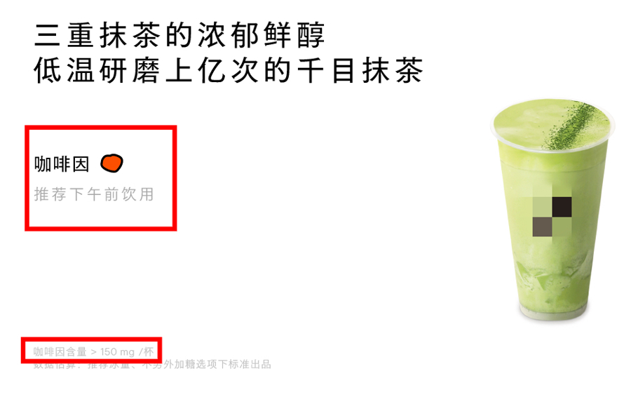 有商家就抹茶茶饮中的咖啡因含量进行了辅导(商家先容截屏)