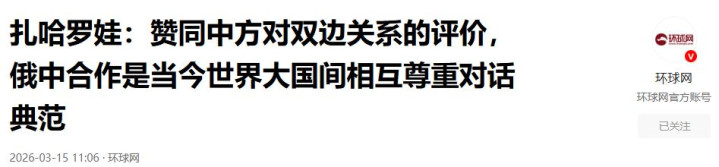 扎哈罗娃:赞同中方对双边关系的评价,俄中合作是现辞寰球大国间互相尊重对话典范——2026-03-15 11:06·民众网