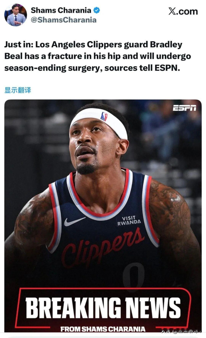 此前他因髋部伤势赛季报销