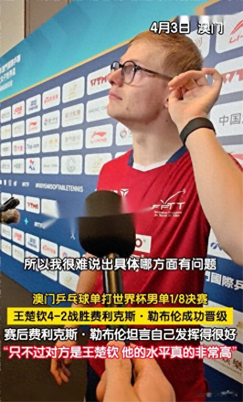 勒布伦在采访里坦率直荡说“我很难说出具体哪方面有问题!谁让那是王楚钦呢”并坦言两东说念主实力是有差距的。