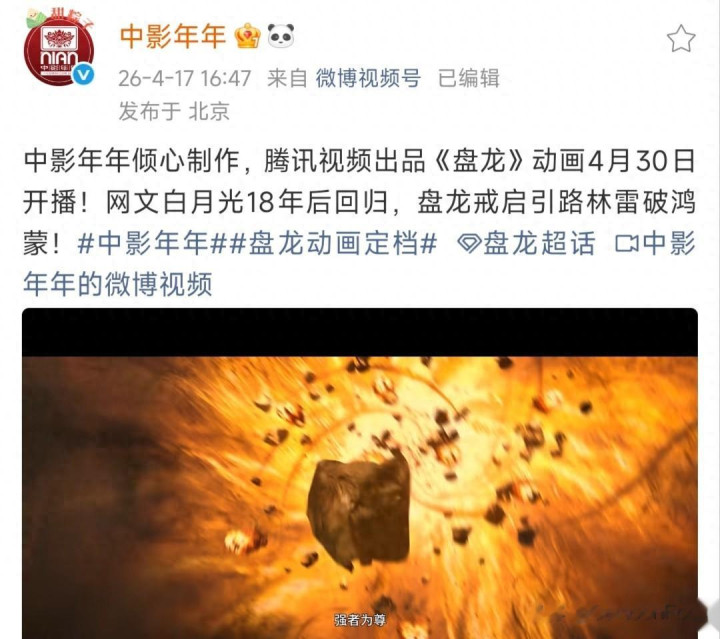 “中影年年倾心制作,腾讯视频出品《盘龙》动画4月30日开播!网文白蟾光18年后回首,盘龙戒启引路林雷破鸿蒙!”