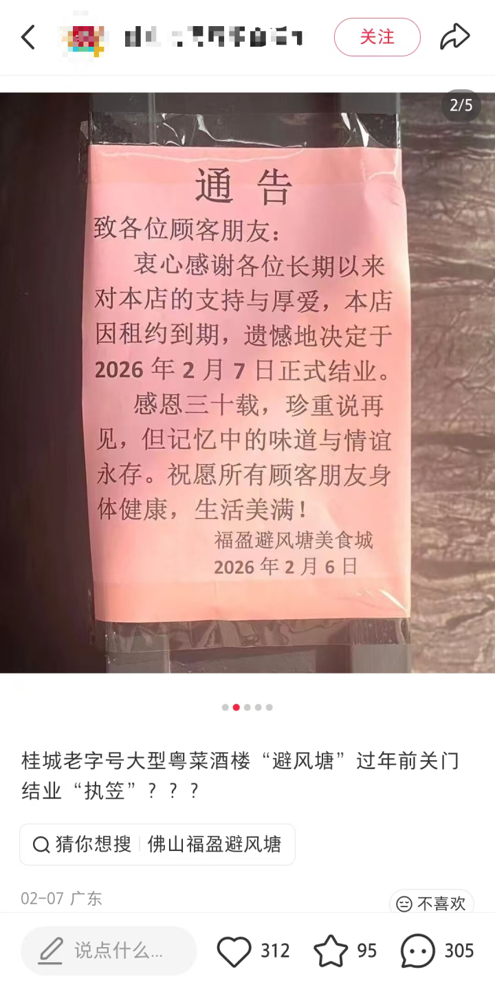 近日,位于佛山市南海区桂城桂澜路的福盈避风塘酒楼正式结业。据通告显示,酒楼因租约到期,遗憾地决定于2026年2月7日正式结业。