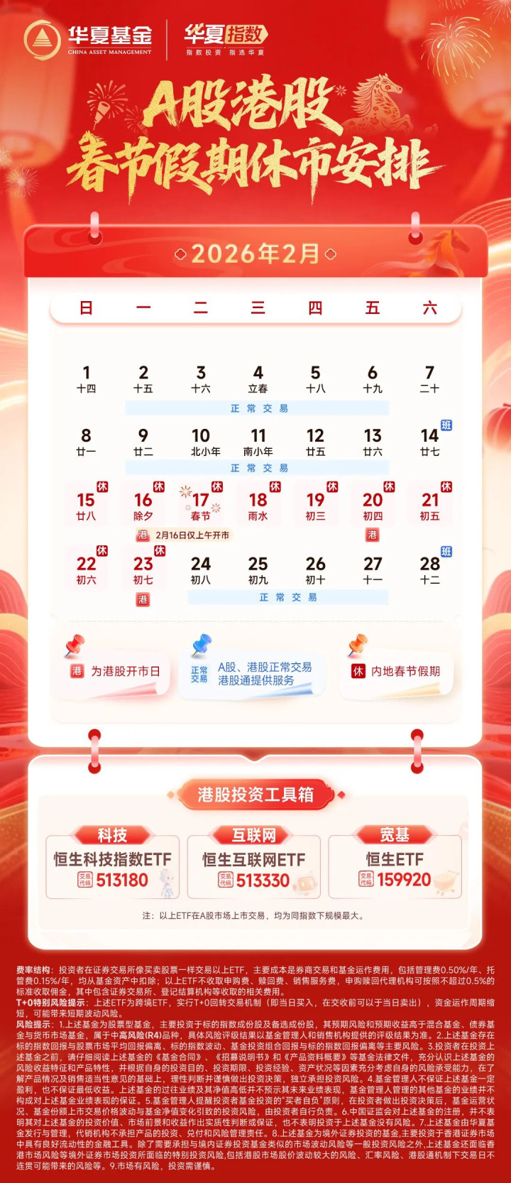港股方面,2月16日(除夕)上昼开市半天、下昼休市,2月17日至19日(月吉至初三)休市3天(2月20日、2月23日照常开市)。
